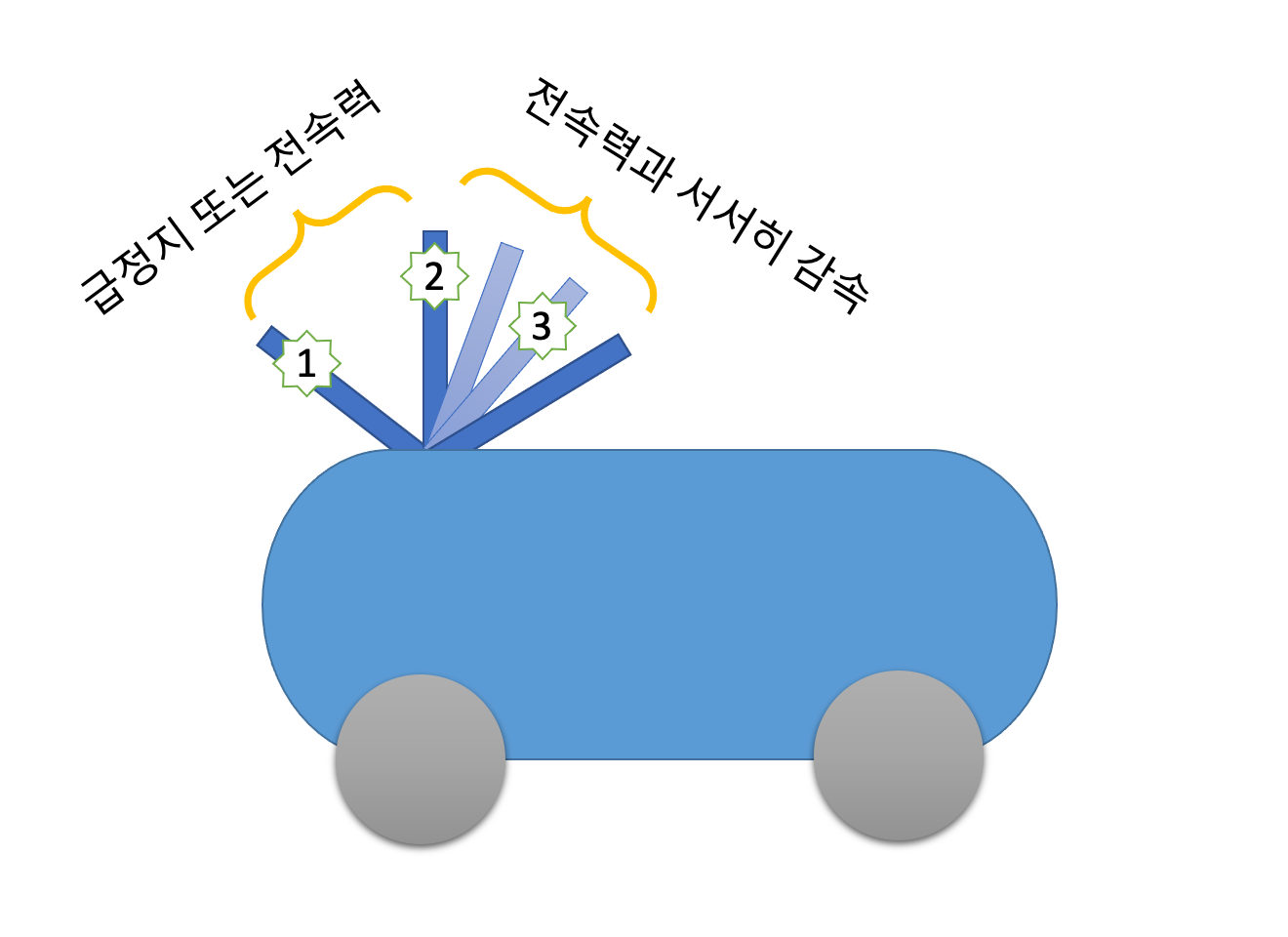 문제는 주행 브레이크 구간(②와 ③ 사이)로 당길 때 꽤 강한 힘이 필요하다는 것이다. 불행하게도, 막내 아들은 주차 브레이크 구간(② 위치)까지만 레버를 당길 힘이 있었다. 즉, 급가속(②)과 급제동(②-①)의 선택지 밖에 없다. 급가속으로 속도가 이미 붙었어도 선택지는 여전히 둘이다. 서서히 멈추는 세번째 선택지는 없다.